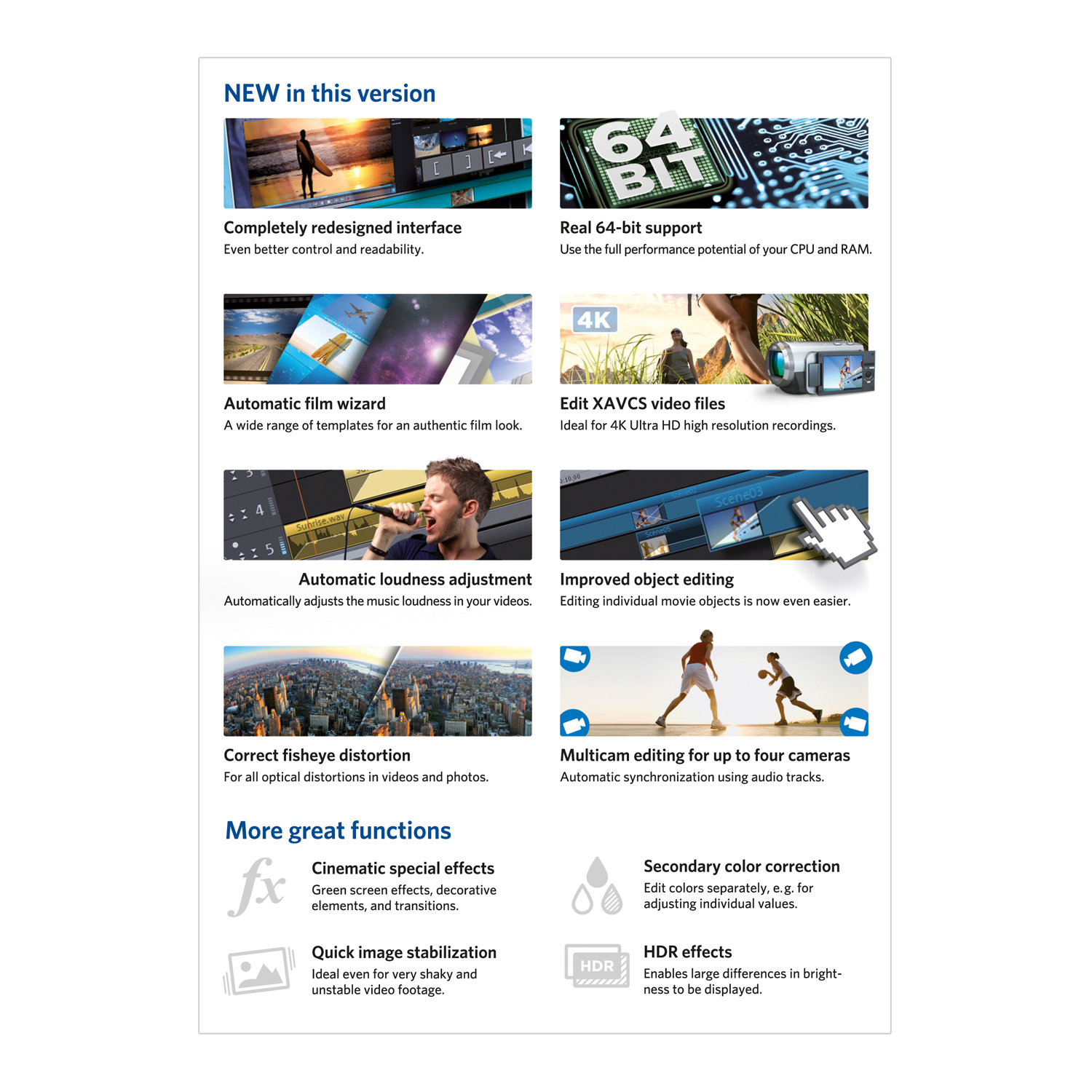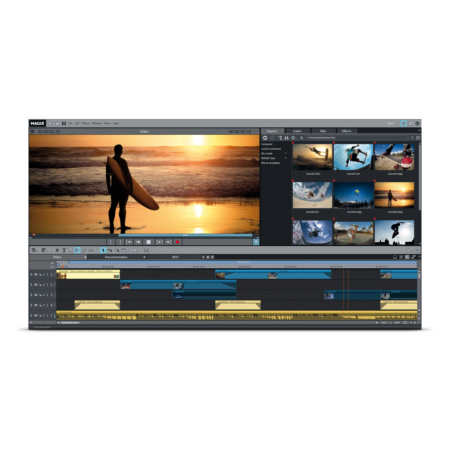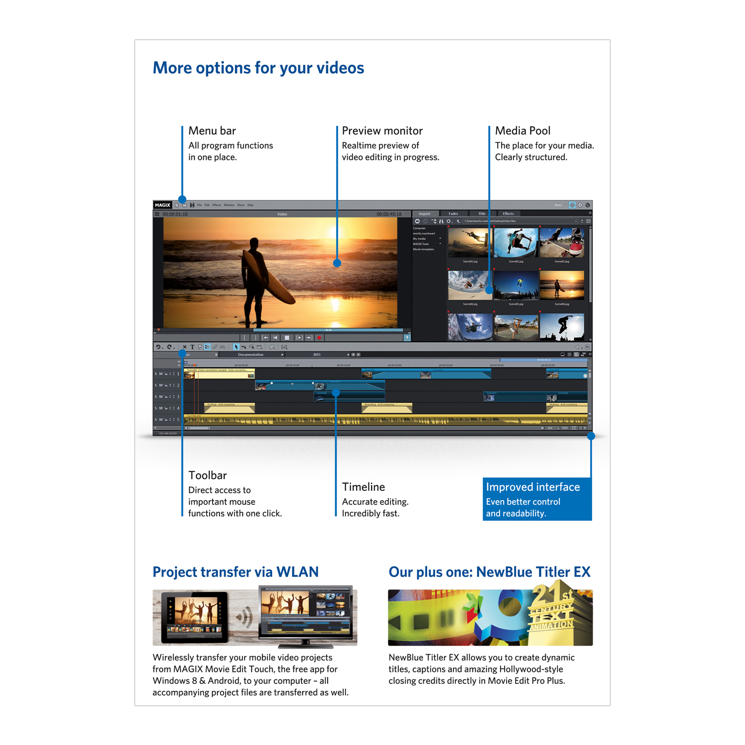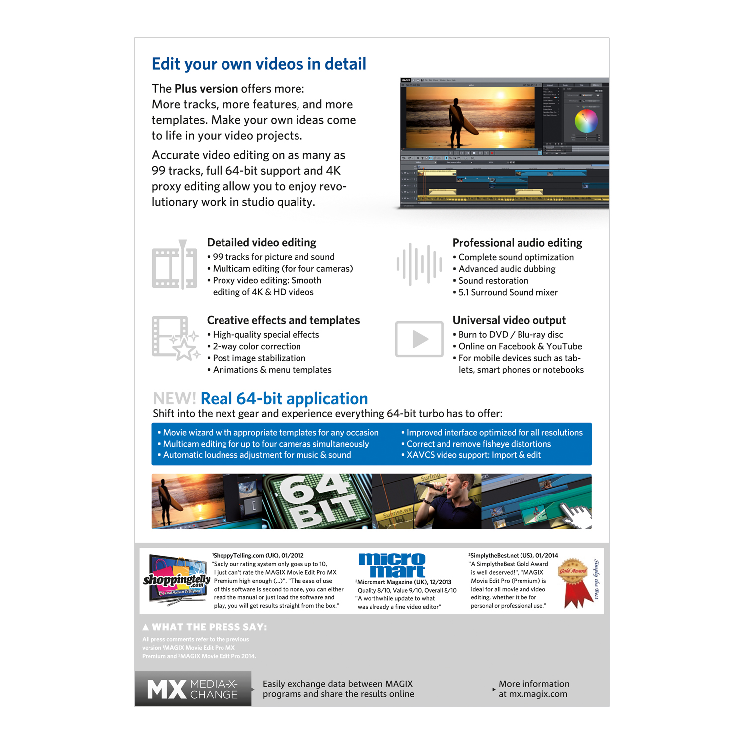 With MAGIX Movie Edit Pro 2015 Plus you can experience complete design freedom when editing your videos. Comprehensive 64-bit support and many new features make it possible to make all of your creative ideas a reality. You own an action cam? With MAGIX Movie Edit Pro 2015 Plus and the new editing templates for action cams you can transform your footage into finished movies even faster than ever before. The included free bonus app MAGIX Movie Edit Touch for Windows and Android tablets makes it possible to edit your videos right where you made them.