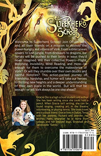 Welcome to Superhero School! Join Oliver, Jess, and all their friends on a mission to destroy the power-hungry, evil villains of Vork. From subterranean sewers to lush jungle, from dinosaurs to dragons, our heroes will be pushed to their limits in ways they’d never imagined. Will their collective Powers—Flight, Morphing, Invisibility, Mind Reading, and more—be enough for them to overcome the malevolence of Vork? Or will they stumble over their own doubts and painful histories? This action-packed journey of friendship, hardship, and humor will take our heroes to thrilling new heights and a deeper understanding of their own place in the world. But will that be enough—or will Vork always be one step ahead?